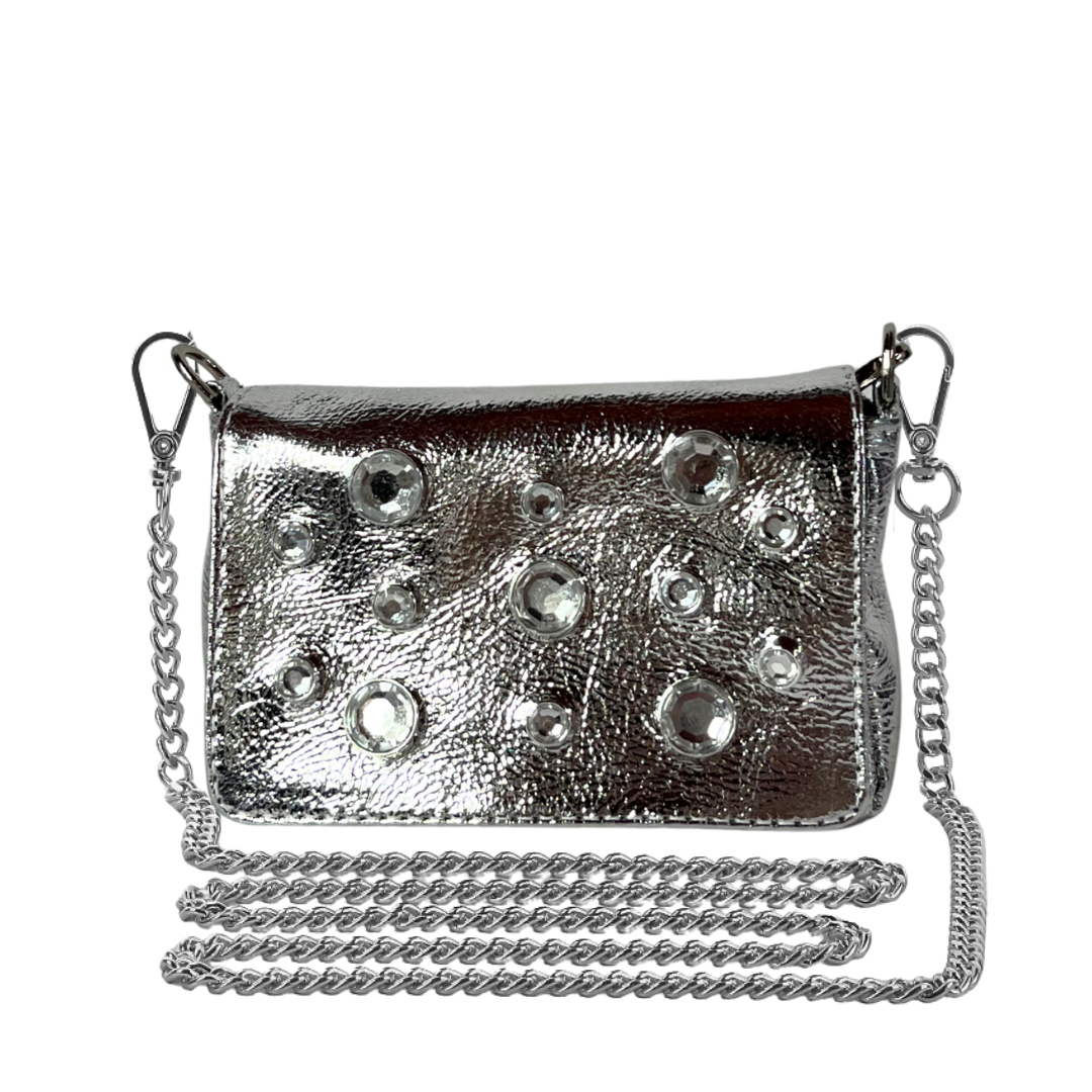Deixe sua presença brilhar com a elegância que só a Mini Bolsa Glam Shine pode oferecer. Com acabamento metalizado prata de alto brilho e uma superfície cravejada com pedras translúcidas facetadas, essa peça é mais do que um acessório — é uma extensão do seu estilo, da sua confiança e do seu momento.