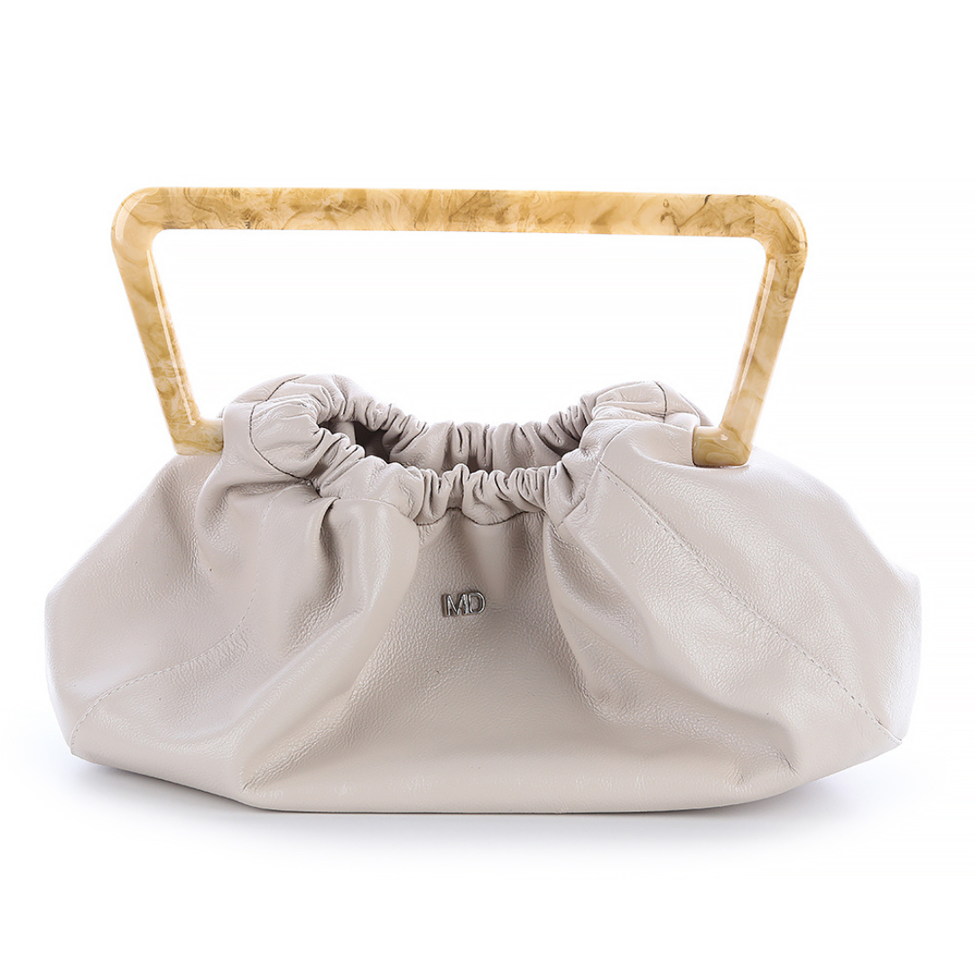 Bolsa Feminina Catarina em Couro Off – White, com design sofisticado e moderno. O modelo apresenta corpo em couro macio com efeito drapeado e alça estruturada em material marmorizado, que adiciona contraste e elegância ao visual. Compacta e estilosa, é perfeita para compor produções contemporâneas, trazendo praticidade sem abrir mão da sofisticação.