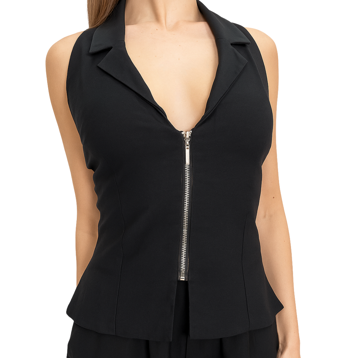 Colete feminino em alfaiataria na cor preta com corte moderno e elegante. O design apresenta decote em V profundo e fechamento frontal com ziper, que conferem um toque sofisticado e exclusivo à peça, acabamento impecável, esse colete é ideal para compor looks refinados, seja em combinações clássicas ou produções fashionistas. Perfeito para quem valoriza estilo e versatilidade no guarda-roupa.
