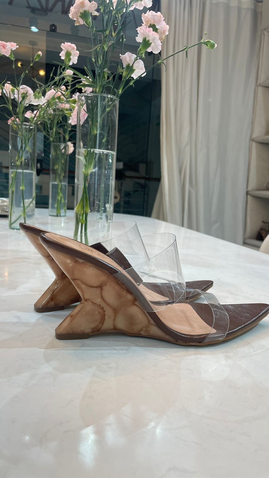 Elegância e ousadia se encontram neste opem mule exclusivo da MD. Com bico fino e tira transparente que abraça o pé com leveza, ele oferece um visual moderno e sofisticado. O salto em formato curvo tipo wedge é o grande destaque: inovador, estável e cheio de personalidade. A palmilha em tom rosa claro adiciona um toque delicado, enquanto o design minimalista garante versatilidade para compor looks tanto casuais quanto glamourosos.