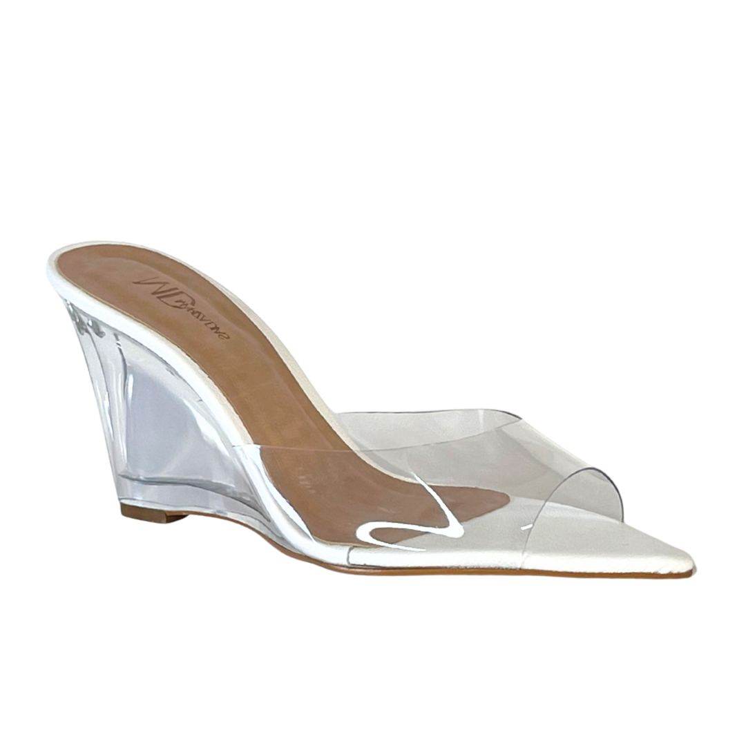 Elegância moderna com conforto real. O salto de 8 cm em acrílico se adapta ao calor do corpo, garantindo maciez ao caminhar, não machuca e não amarela com o tempo. O vinil transparente cria um visual leve e sofisticado, perfeito para compor looks versáteis e glamourosos. Acabamento em couro.