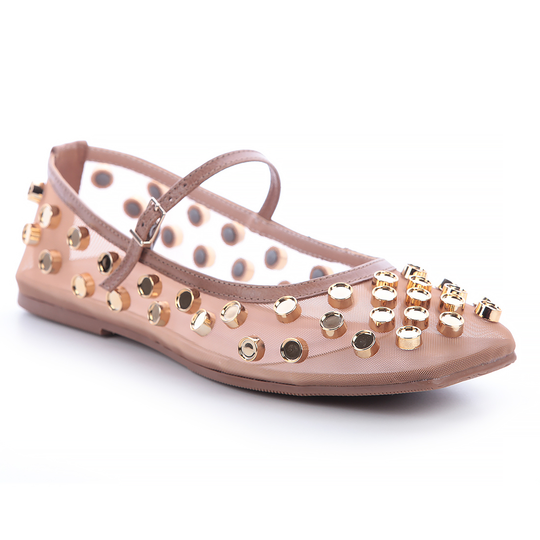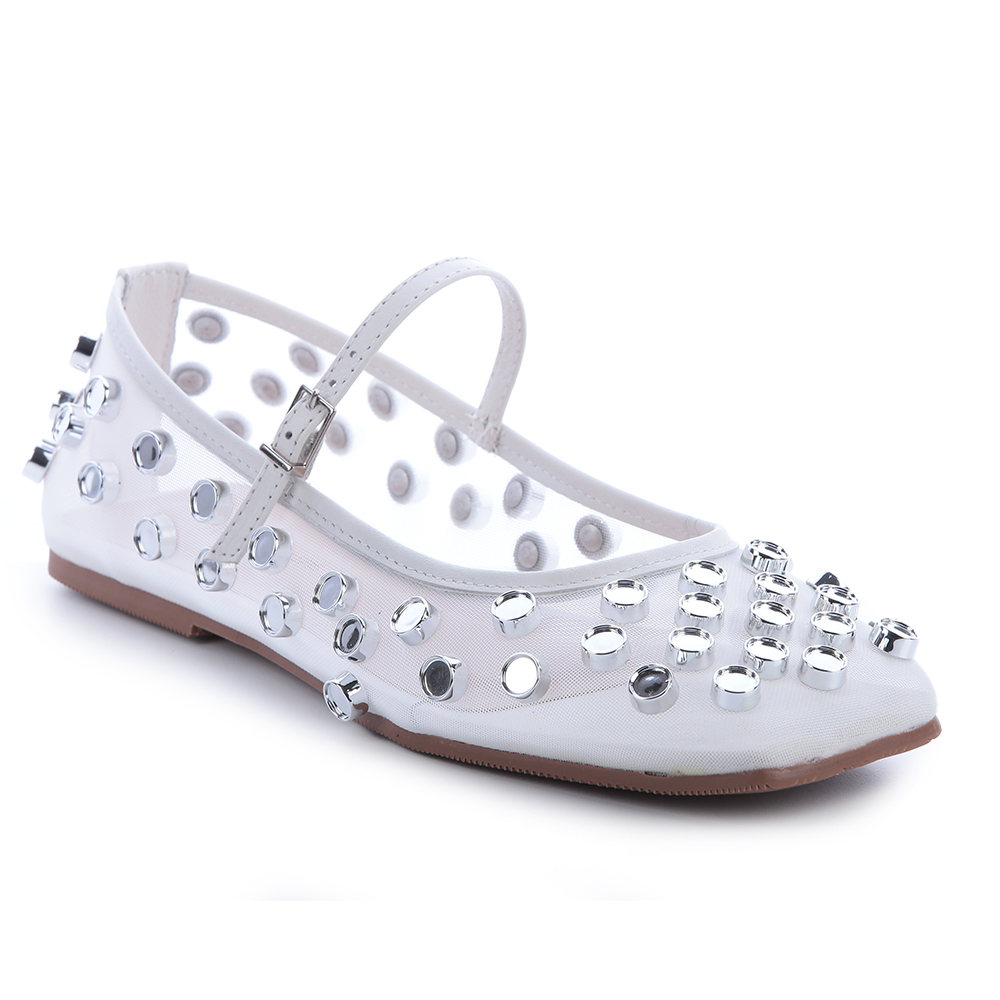 Calçado produzido em tela com detalhes em couro e aplicações de esferas cromadas, fechamento com regulagem e elástico para ter ,ais conforto no calce. Essa sapatilha é uma verdadeira jóia, transforma qualquer look básico em o LOOK, leve, confortável e macia. Recomendamos pegar um número menor se o seu pé for fino.